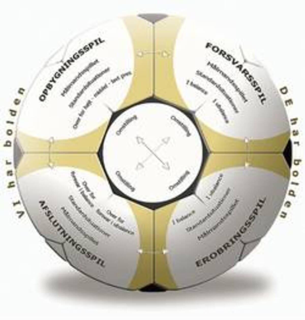 De forskellige VI-elementer er: Opbygningsspil: Målmandsspillet. Standardsituationer. Over for højt/middel/lavt pres. Afslutningsspil: Målmandsspillet. Standardsituationer. Over for forsvar i balance. Over for forsvar i ubalance (numerisk/positionelt). Overgange: Hvordan går vi fra opbygningsspil til afslutningsspil, og fra afslutningsspil til opbygningsspil Omstillinger (DE til VI): Fra forsvarsspil til opbygningsspil/afslutningsspil, og fra erobringsspil til opbygningsspil/afslutningsspil. De forskellige DE-elementer er: Forsvarsspil: Målmandsspillet. Standardsituationer. I balance. I ubalance (numerisk/positionelt). Erobringsspil: Målmandsspillet. Standardsituationer. I balance. I ubalance (numerisk/positionelt). Overgange: Hvordan går vi fra forsvarsspil til erobringsspil, og fra erobringsspil til afslutningsspil. Omstillinger (VI til DE): Fra opbygningsspil til forsvarsspil/erobringsspil, og fra afslutningsspil til forsvarsspil/erobringsspil. |