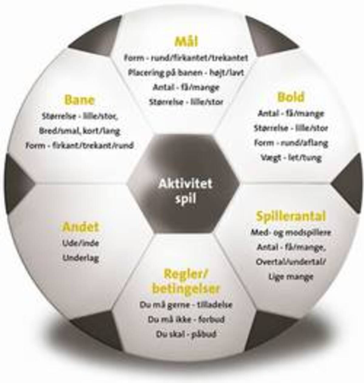 De seks parametre er: Bane: Størrelse - lille/stor, bred/smal, kort/lang. Form - firkant/trekant/rund. Mål: Form - rund/firkantet/trekantet. Placering på banen - højt/lavt. Antal - få/mange. Størrelse - lille/stor. Bold: Antal - få/mange. Størrelse - lille/stor. Form - rund/aflang. Vægt - let/tung. Spillerantal: Med- og modspillere. Antal - få/mange, overtal/undertal/lige mange. Regler/betingelser: Du må gerne - tilladelse. Du må ikke - forbud. Du skal - påbud. Andet: Ude/inde. Underlag. |