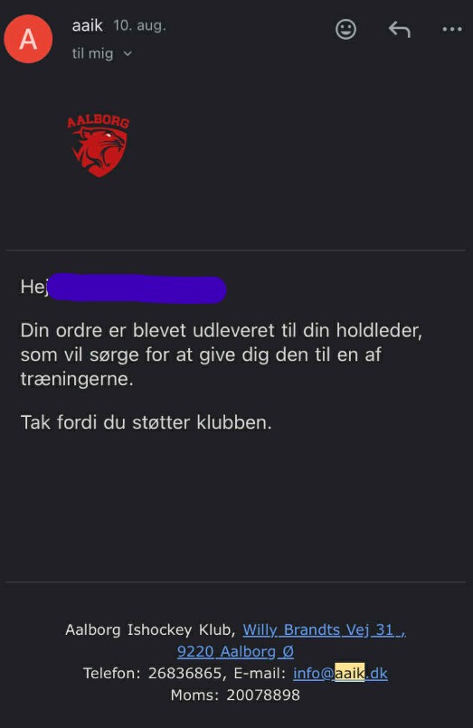 Når der kommer mange ordre ind, er det vigtigt for mig, at I husker at kontakte jeres holdleder, så snart I modtager denne mail (se vedhæftet). Jeg har lagt jeres varer i et aflåst skab, som alle holdledere har adgang til og koden til. Det er derfor jeres holdleder, der står for at udlevere varerne til jer.