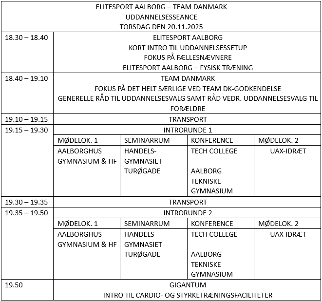 Programmet indbefatter en kort intro fra Elitesport Aalborgs side, Team Danmarks oplæg og i forlængelse heraf er der fokus på mulighederne på de 4 lokale Team Danmark-uddannelsespartnere med to ”besøgsrunder”.