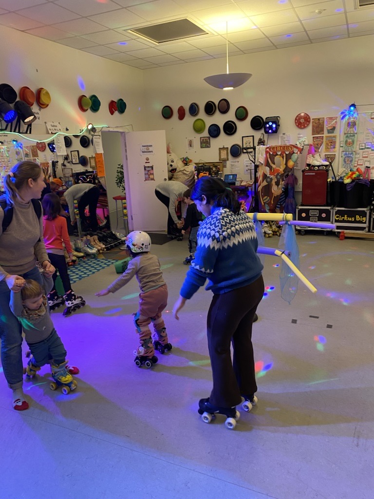 Det er muligt at låne rulleskøjter. Der er også "forældreparkering" med kaffe/te i studiet.