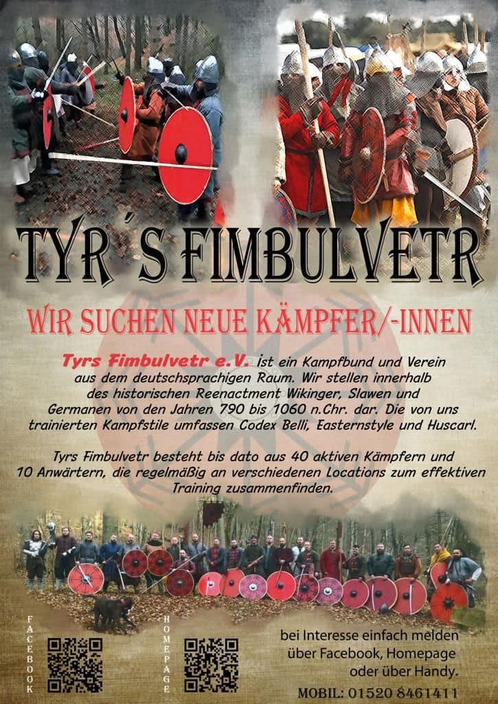 Wenn du Interesse am historischen Kampfsport, Reenactment der oben genannten Zeiträumen/Darstellungen, gemeinsamen Lagern, frühmittelalterlichen Bräuchen, Mittelaltermärkten und dem Heidentum hast, kannst du uns gerne über die offizielle Seite von Tyrs Fimbulvetr kontaktieren. Wir suchen aktive Kämpfer (Nah- oder Fernkampf) - egal, ob Frau oder Mann, klein oder groß - ab 18 Jahre, die an den regelmäßigen Trainings an den jeweiligen Standorten teilnehmen möchten. Es spielt keine Rolle, ob du Kampferfahrung mitbringst oder nicht, da wir die Trainings so strukturieren, dass auch Anfänger die Möglichkeit haben, in den Kampfsport rein zu wachsen.