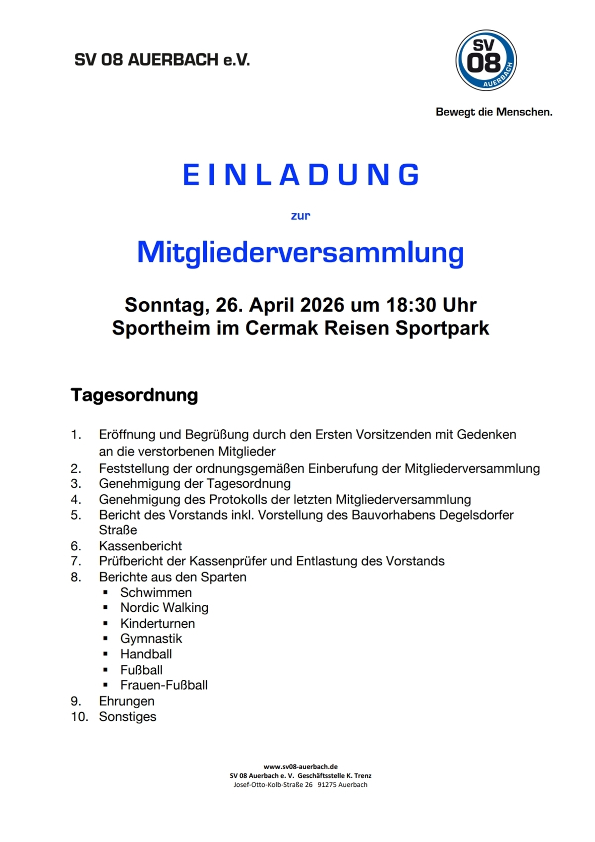 Mitgliederversammlung SV 08 Auerbach - Sonntag, 26.04.2026 um 18:30 Uhr
